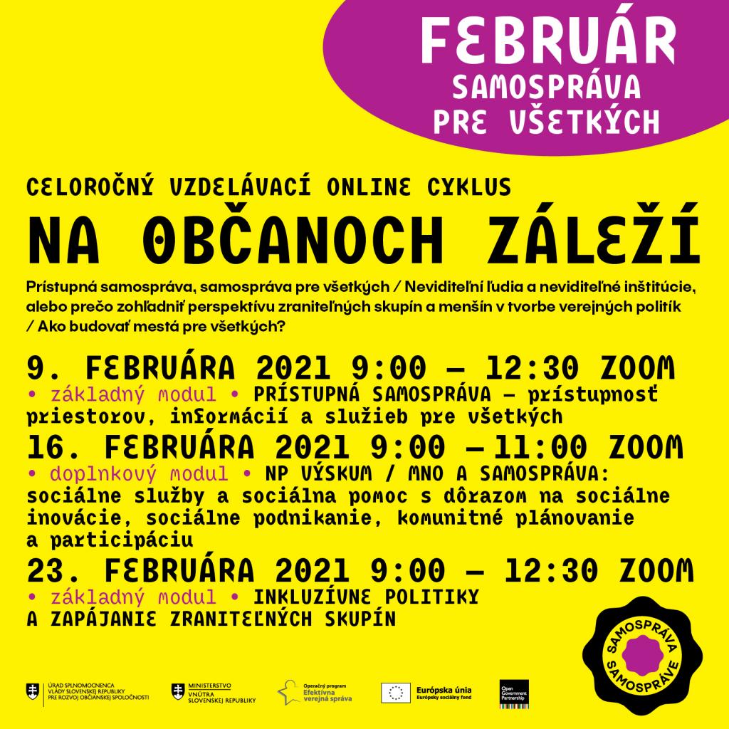 Na občanoch záleží je názov nového vzdelávacieho programu pre samospravu - obce, mestá, mestské časti i samosprávne kraje. Aj keď nás druhá vlna pandémie zahnala do virtuálnych salónov a kabinetov, nevzdávame to. Už od decembra 2020 plánujeme, dizajnujeme a dolaďujeme nový program podujatí na rok 2021.